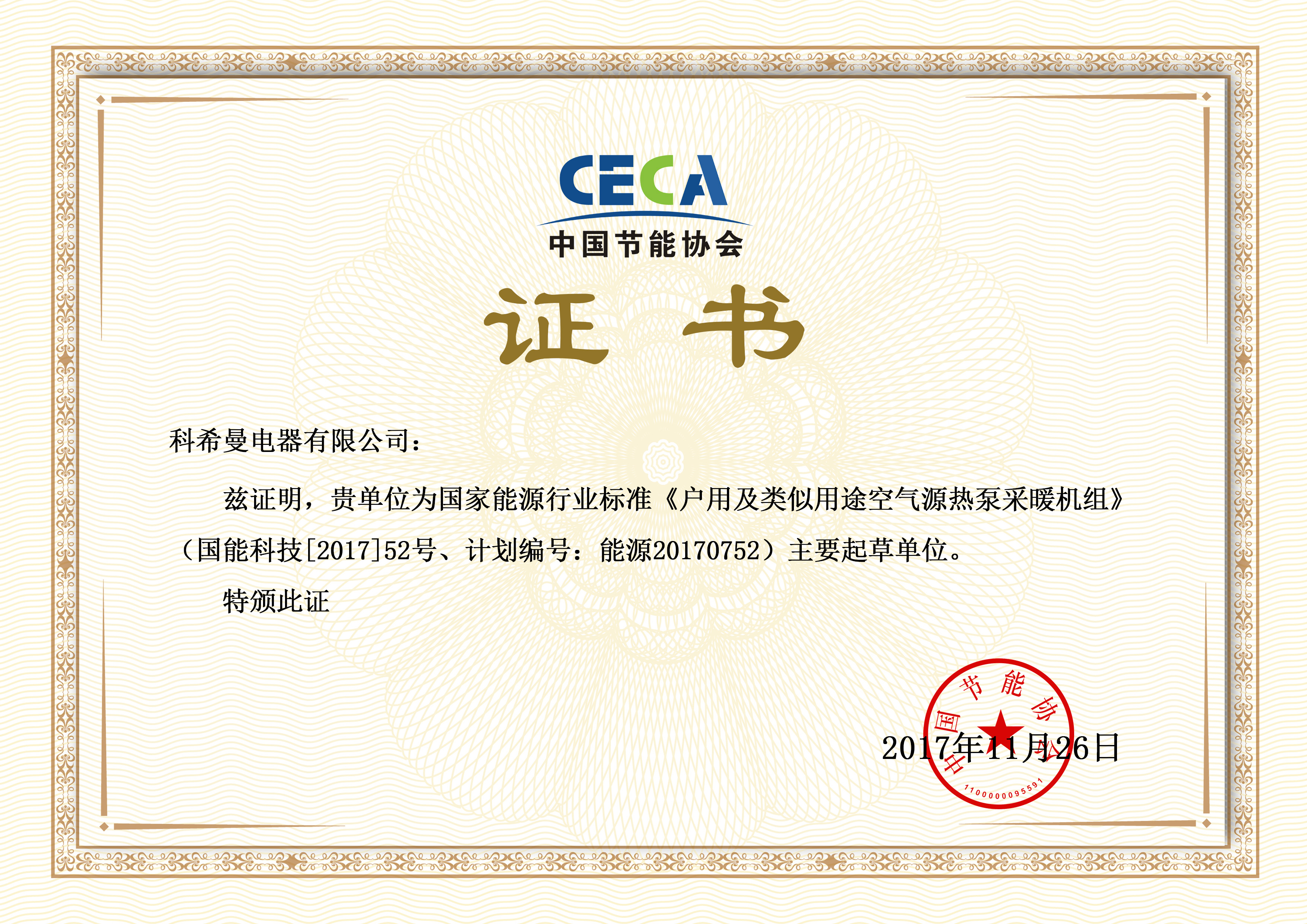 早在2017年,科希曼就已經(jīng)獲得一項國家標準主要起草單位認證——國家能源標準《戶用及類似用途空氣源熱泵采暖機組》主要起草單位。