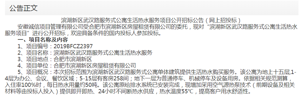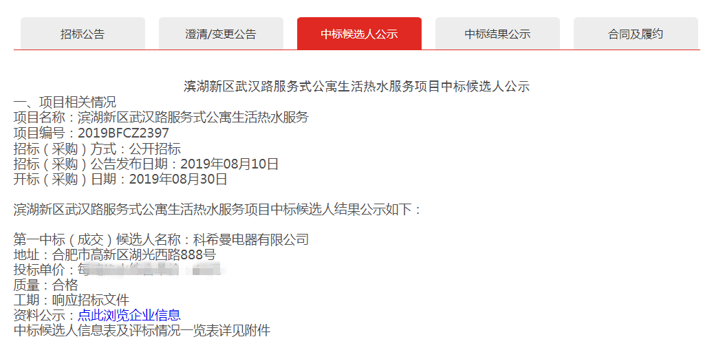 根據(jù)安徽合肥公共資源交易中心網(wǎng)站顯示,由合肥市濱湖新區(qū)房屋租賃有限公司公開招標(biāo)的濱湖新區(qū)武漢路服務(wù)式公寓生活熱水服務(wù)項(xiàng)目經(jīng)過評(píng)估篩選公布中標(biāo)結(jié)果,科希曼均符合項(xiàng)目要求成為唯一中標(biāo)單位。