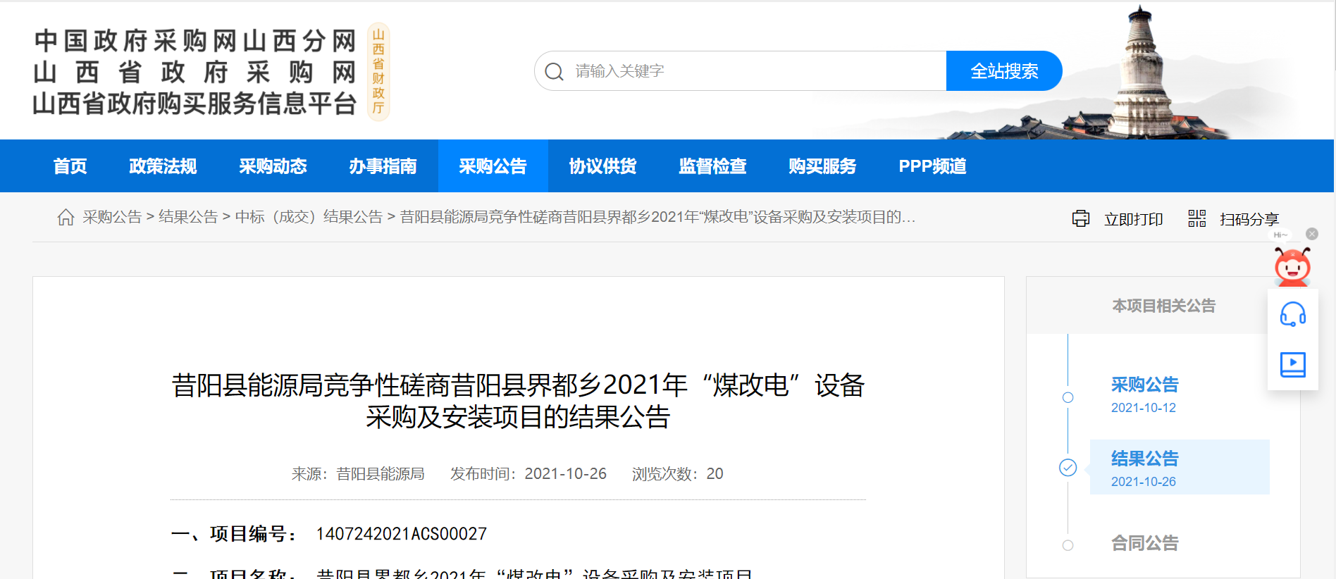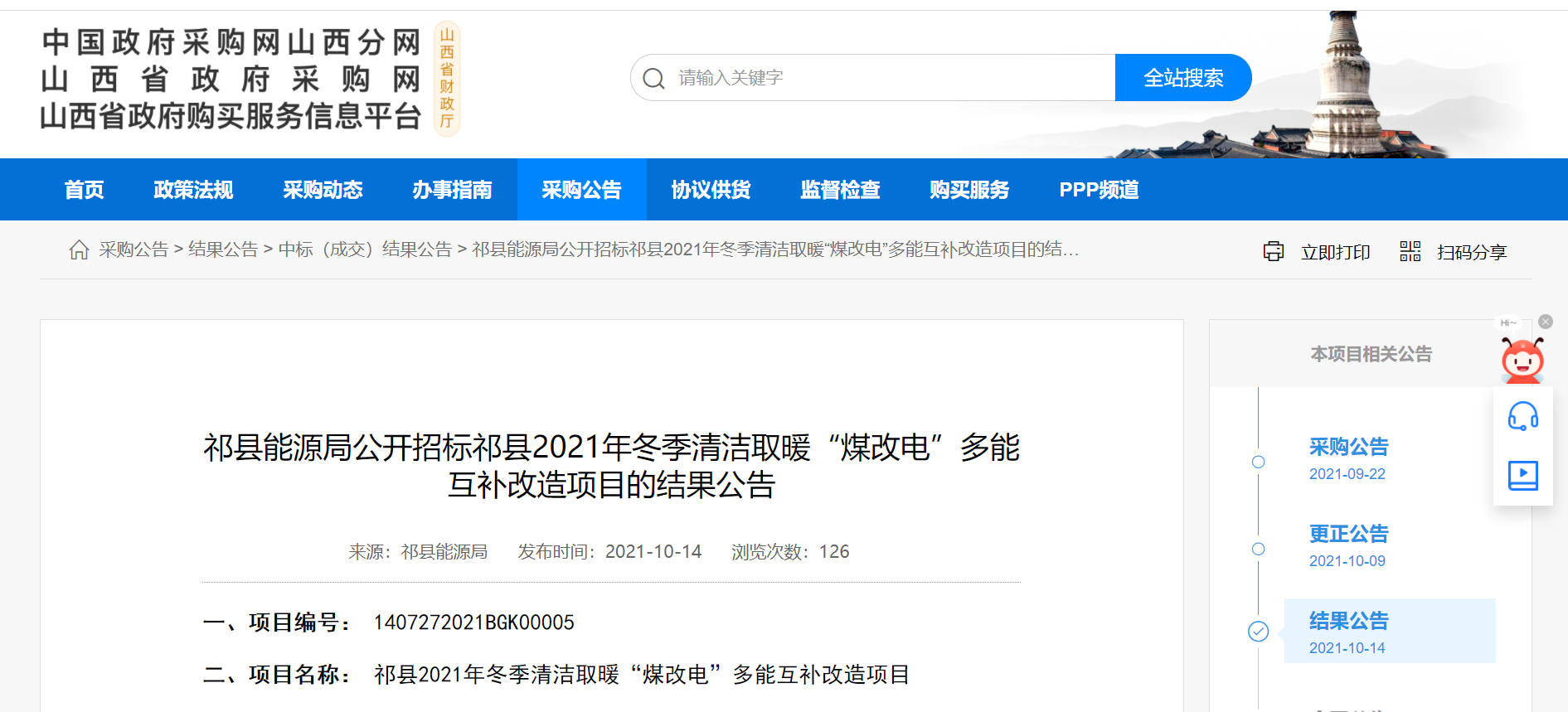 近日,山西省政府采購網(wǎng)發(fā)布中標(biāo)公告,科希曼成功中標(biāo)山西省昔陽縣界都鄉(xiāng)2021“煤改電”設(shè)備采購及安裝項(xiàng)目??葡B漠a(chǎn)品也已服務(wù)山西多地,為山西省的清潔取暖貢獻(xiàn)出自己的力量。
