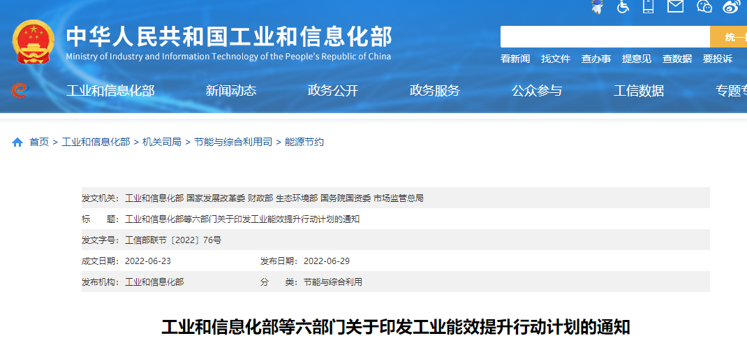 6月29日,工業(yè)和信息化部、國(guó)家發(fā)展改革委、財(cái)政部、生態(tài)環(huán)境部、國(guó)務(wù)院國(guó)資委、市場(chǎng)監(jiān)管總局近日聯(lián)合印發(fā)《工業(yè)能效提升行動(dòng)計(jì)劃》,提出到2025年,重點(diǎn)工業(yè)行業(yè)能效全面提升,數(shù)據(jù)中心等重點(diǎn)領(lǐng)域能效明顯提升,綠色低碳能源利用比例顯著提高,節(jié)能提效工藝技術(shù)裝備廣泛應(yīng)用,標(biāo)準(zhǔn)、服務(wù)和監(jiān)管體系逐步完善,鋼鐵、石化化工、有色金屬、建材等行業(yè)重點(diǎn)產(chǎn)品能效達(dá)到國(guó)際先進(jìn)水平,規(guī)模以上工業(yè)單位增加值能耗比2020年下降13.5%。能盡其用、效率至上成為市場(chǎng)主體和公眾的共同理念和普遍要求,節(jié)能提效進(jìn)一步成為綠色低碳的“第一能源”和降耗減碳的首要舉措。
