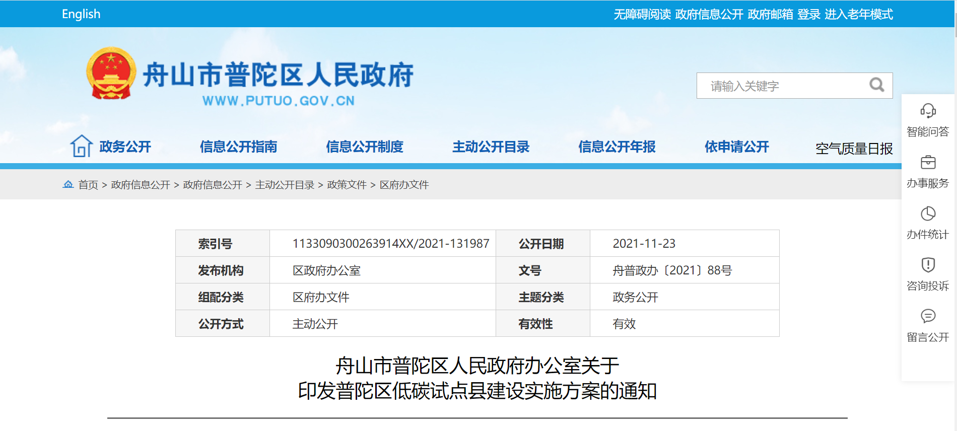 近日,舟山市普陀區(qū)人民政府發(fā)布《舟山市普陀區(qū)人民政府辦公室關于印發(fā)普陀區(qū)低碳試點縣建設實施方案的通知》,通知指出:普陀區(qū)作為浙江省第一批低碳能源發(fā)展類試點縣創(chuàng)建單位,擬通過3-5年創(chuàng)建期,率先實現(xiàn)碳達峰與碳中和,全力打造全省能源低碳發(fā)展的“普陀樣板”。