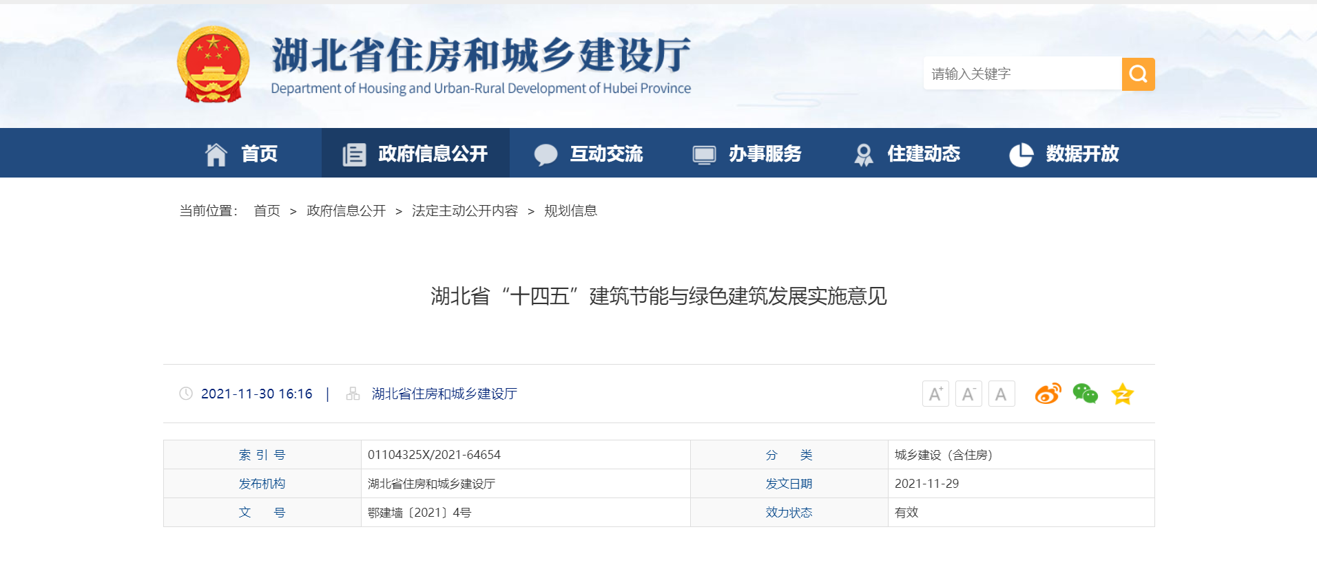 近日,湖北省住房和城鄉(xiāng)建設廳于印發(fā)湖北省“十四五”建筑節(jié)能與綠色建筑發(fā)展實施意見。