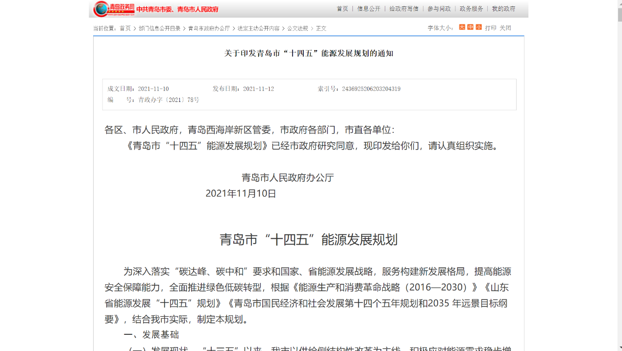 為深入落實“碳達(dá)峰、碳中和”要求和國家、省能源發(fā)展戰(zhàn)略,服務(wù)構(gòu)建新發(fā)展格局,提高能源安全保障能力,全面推進(jìn)綠色低碳轉(zhuǎn)型,青島市人民政府印發(fā)《青島市“十四五”能源發(fā)展規(guī)劃》。