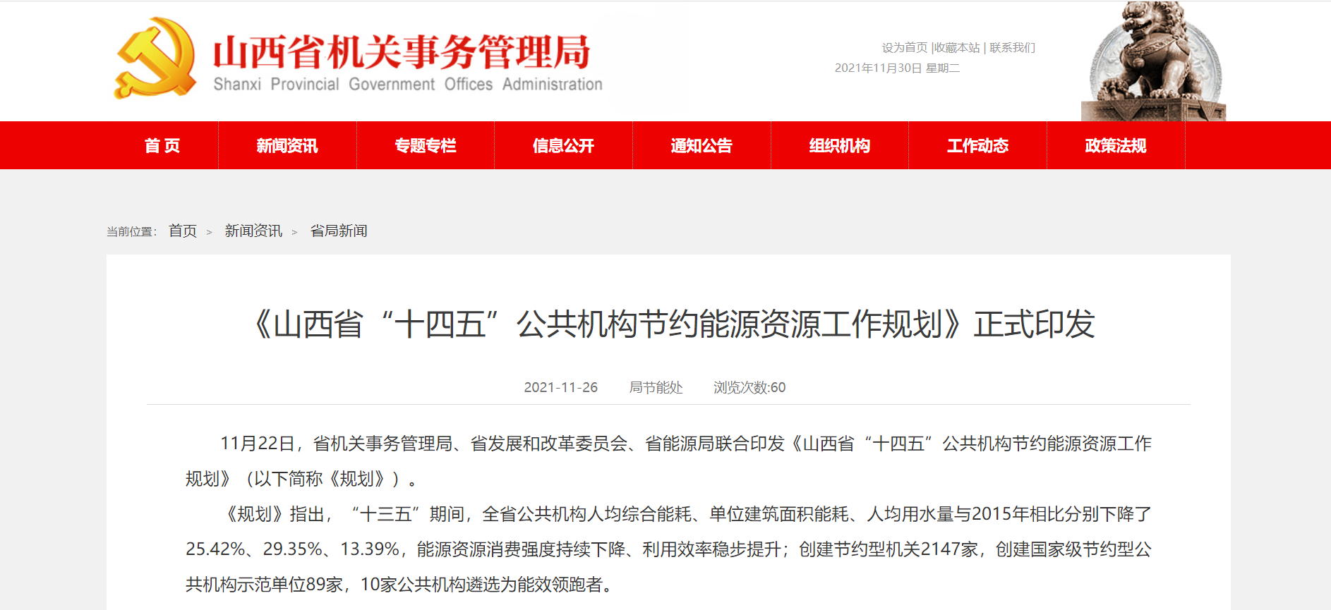 日前,山西省機關(guān)事務(wù)管理局、省發(fā)改委、省能源局日前聯(lián)合印發(fā)《山西省“十四五”公共機構(gòu)節(jié)約能源資源工作規(guī)劃》(以下簡稱《規(guī)劃》)。明確提出,“十四五”期間,山西省實施“十大行動”,助力全省公共機構(gòu)綠色低碳轉(zhuǎn)型。