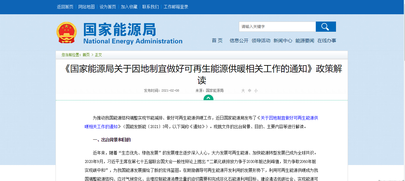近期,國(guó)家能源局發(fā)布《國(guó)家能源局關(guān)于因地制宜做好可再生能源供暖工作的通知 國(guó)能發(fā)新能〔2021〕3號(hào)》,提出因地制宜推廣各類可再生能源供暖技術(shù),充分發(fā)揮各類可再生能源在供暖中的積極作用,具體內(nèi)容如下: