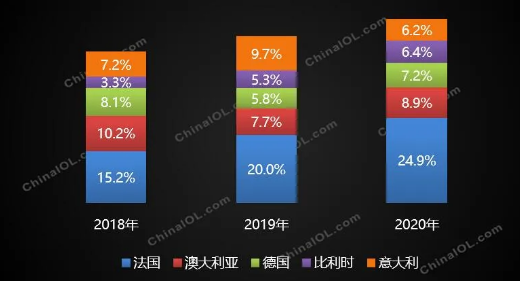 從下圖可以看出,2018-2020年前三季度,出口量前五名國家集中度越來越高,2020年前三季度的空氣源熱泵出口市場中,前五名國家集中度已經(jīng)超過了50%,其中,四國為歐洲國家??諝庠礋岜卯a(chǎn)品出口到法國、比利時等歐洲國家的數(shù)量,占整個出口市場的份額也在逐步提升。