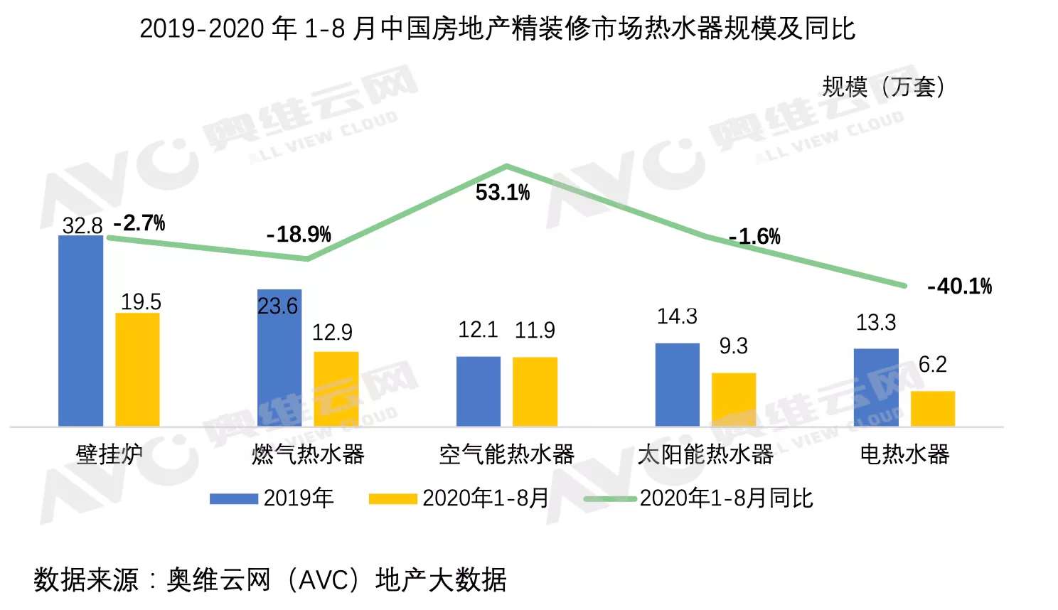 同時(shí),根據(jù)奧維云網(wǎng)(AVC)地產(chǎn)大數(shù)據(jù)顯示:2020年1-8月精裝市場(chǎng)空氣能熱水器逆勢(shì)增長(zhǎng),配套規(guī)模達(dá)11.9萬(wàn)套,同比增長(zhǎng)達(dá)53.1%,是目前熱水器產(chǎn)品五大類型中唯一一個(gè)正增長(zhǎng)的品類,其配套率也從去年同期的2.5%增至3.8%,躍居熱水器行業(yè)第三;壁掛爐依然穩(wěn)居第一,配套規(guī)模為32.8萬(wàn)套;燃?xì)鉄崴魍认陆?8.9%;太陽(yáng)能熱水器和電熱水器配套規(guī)模有所下滑,分別為9.3萬(wàn)套、6.2萬(wàn)套,其中電熱水器同比下降40.1%。空氣能熱水器份額大幅增長(zhǎng),究其原因,受節(jié)能政策影響,采用空氣能熱水器的開發(fā)商增多。據(jù)奧維云網(wǎng)(AVC)地產(chǎn)大數(shù)據(jù)顯示:2020年1-8月配套空氣能熱水器的開發(fā)商有79家,去年同期61家,同比增長(zhǎng)29.5%,其中50強(qiáng)依舊為主力,份額接近7成。