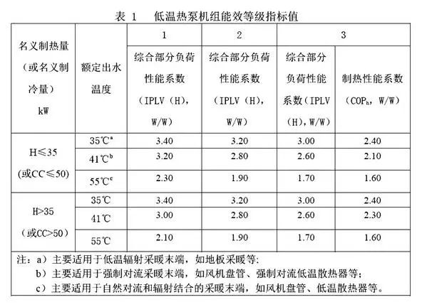 這項(xiàng)標(biāo)準(zhǔn)要求低溫?zé)岜脵C(jī)組能效等級(jí)依據(jù)性能系數(shù)的大小確定,依次分成1、2、3三個(gè)等級(jí),1級(jí)表示能效最高。根據(jù)產(chǎn)品的名義制熱量、額定出水溫度,確定產(chǎn)品的類別;依據(jù)表1判定該類別產(chǎn)品的額定能效等級(jí)。對(duì)于產(chǎn)品涵蓋不同額定出水溫度工況時(shí),應(yīng)測(cè)試每個(gè)額定出水溫度工況下的能效指標(biāo),應(yīng)均不小于表1中能效等級(jí)所對(duì)應(yīng)的指標(biāo)規(guī)定值。